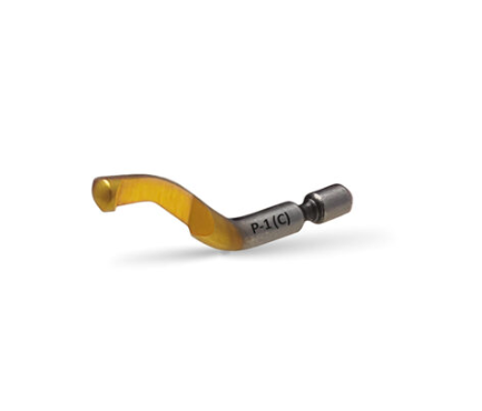 - Powłoka TiN (azotek tytanu) na ostrzu P-1 do usuwania zadziorów z twardych metali i dłuższej żywotności.